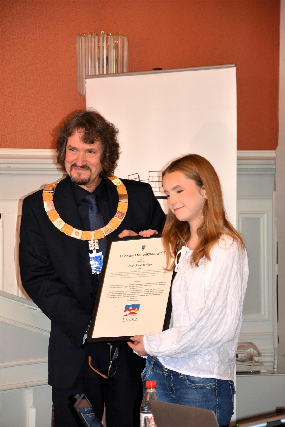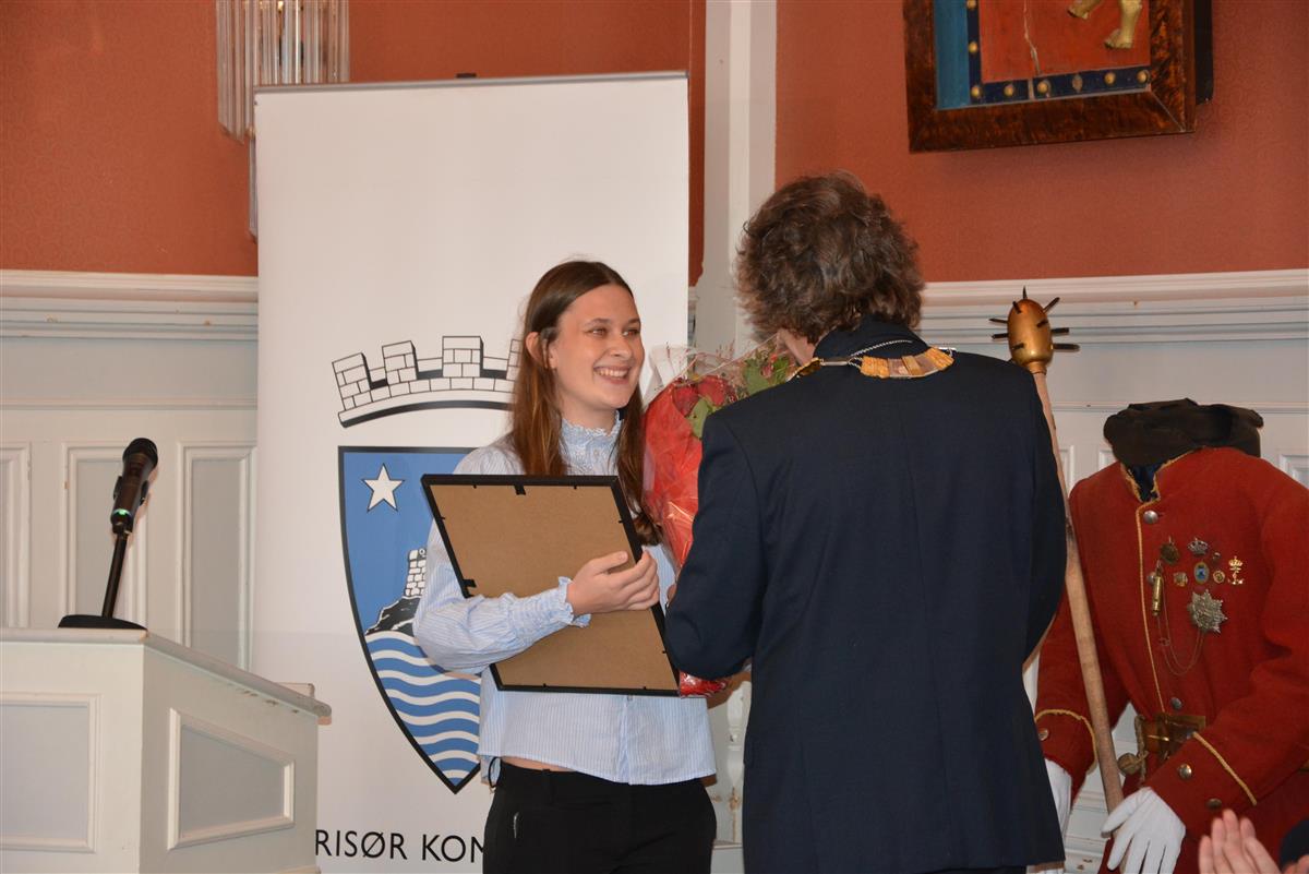 Emilie vinner prisen for sine prestasjoner som saksofonist. Hun er aktiv i Risør Skolemusikkorps, hospitant i Risør Musikkorps og deltar jevnlig sammen med voksne musikere. Gjennom sitt musikalske nivå, sin rolle som forbilde for yngre utøvere og sin evne til å bidra positivt i flere kulturelle fellesskap, har Emilie markert seg på en svært sterk måte, og viser med dette at hun er en verdig mottaker av talentprisen.
