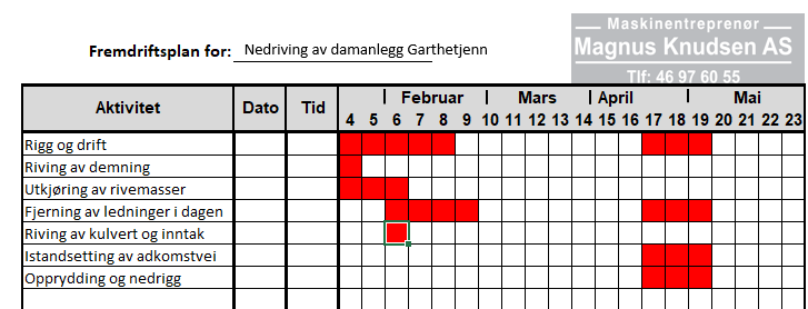 Arbeidene med å fjerne demning med tilhørende installasjoner ved Gartetjenn fikk et avbrudd i høst pga. uventede grunneierforhold, som ble løst rundt jul. Entreprenør Magnus Knudsen AS fortsetter arbeidene, og arbeider etter en ny fremdriftsplan som gjengitt under. Det legges opp til arbeider ut januar og i februar med en pause fram til april igjen. Snøforholdene skaper allerede noen utfordringer, og det opplyses at det vil kunne bli en stans igjen ved økte snømengder.